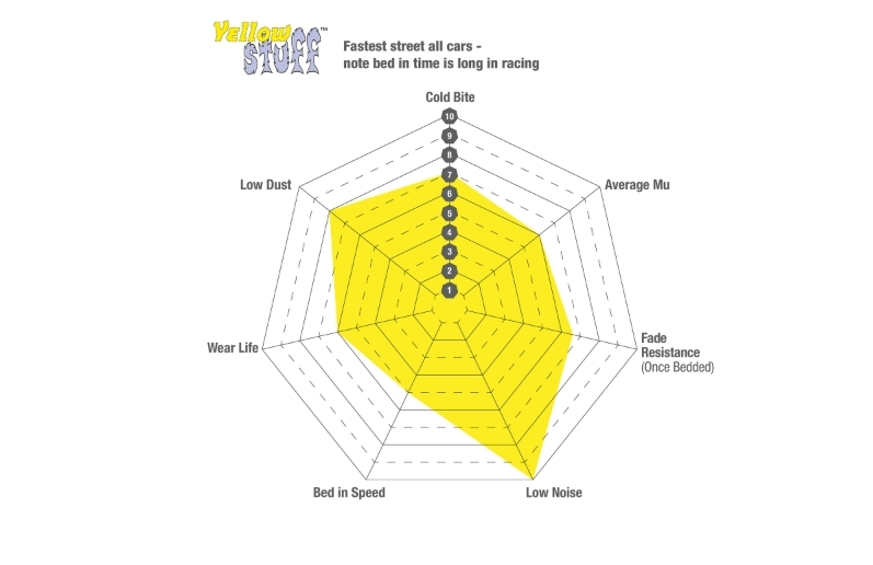 Mit einem stabilen Reibwert von 0,48 µ bis hin zu Renntemperaturen von 450 °C ist Yellowstuff ein sehr beliebter Belag bei Kit-Car-Fahrern und leichteren Rennwagen, die die MX5-Rennserie gewonnen haben. Obwohl die Mischung hitzebeständig ist, muss sie vor dem Renneinsatz sorgfältig eingefahren werden (siehe Anleitung hier).